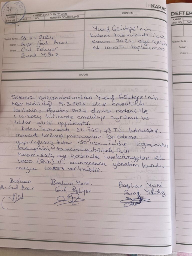 Yusuf Göktepe’nin kıdem tazminatı için ek 1000 TL toplanması kararı alınmıştır.